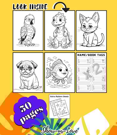 A captivating (8.5" x 11") 50-page coloring book designed for kids, featuring adorable animals and engaging patterns.